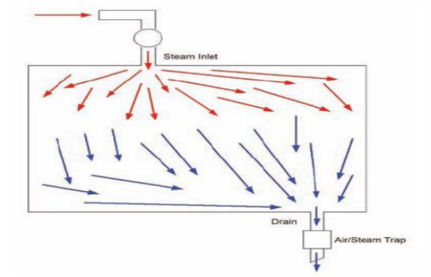 滅菌柜腔室中的冷空氣比進入的蒸汽重,因而下沉到腔室的底部。蒸汽從滅菌柜上部進入腔室,迫使冷空氣從腔室底部的排水管排出。也就是我們通常所說的“置換”,如下圖。